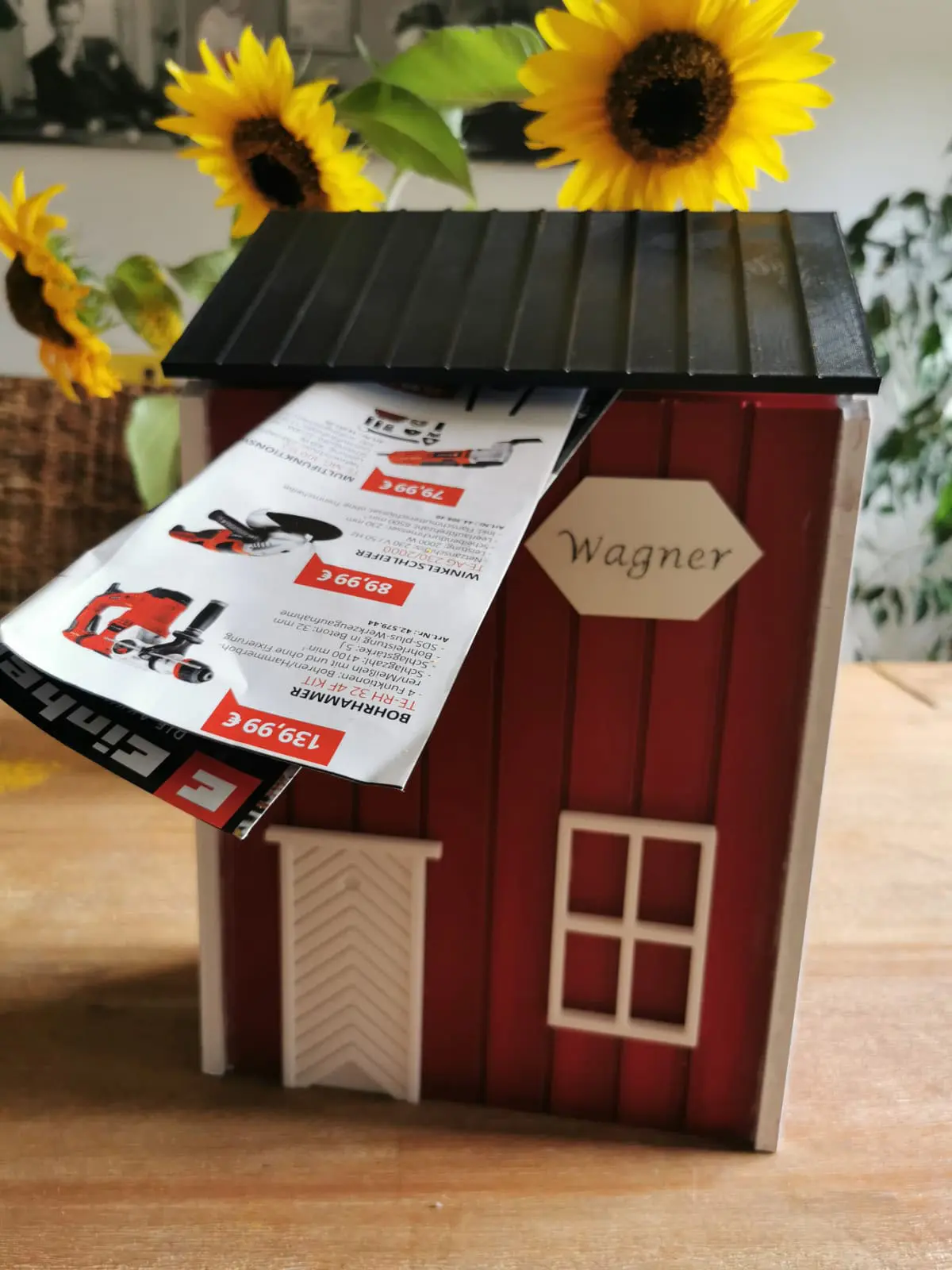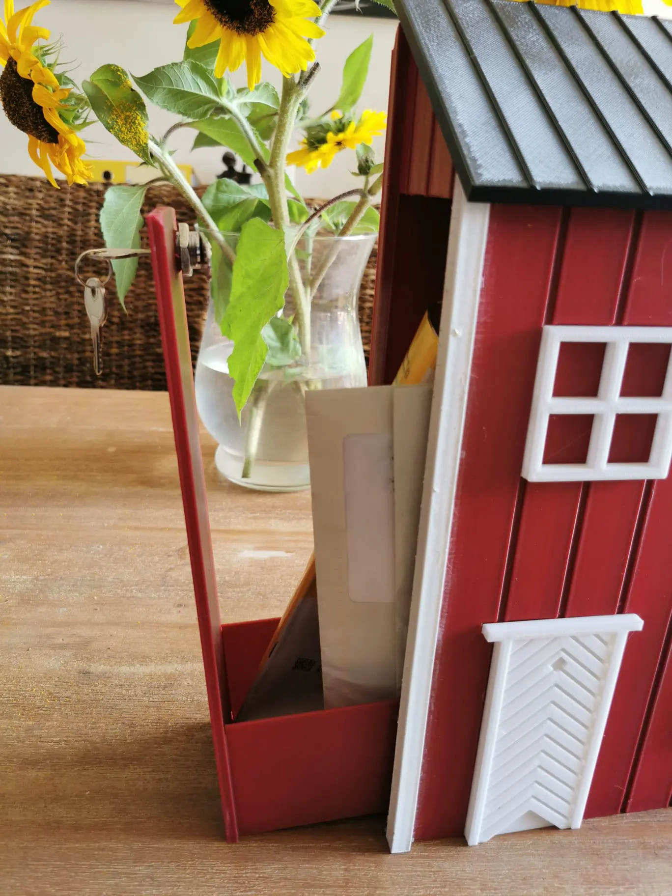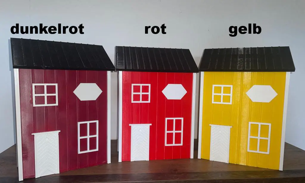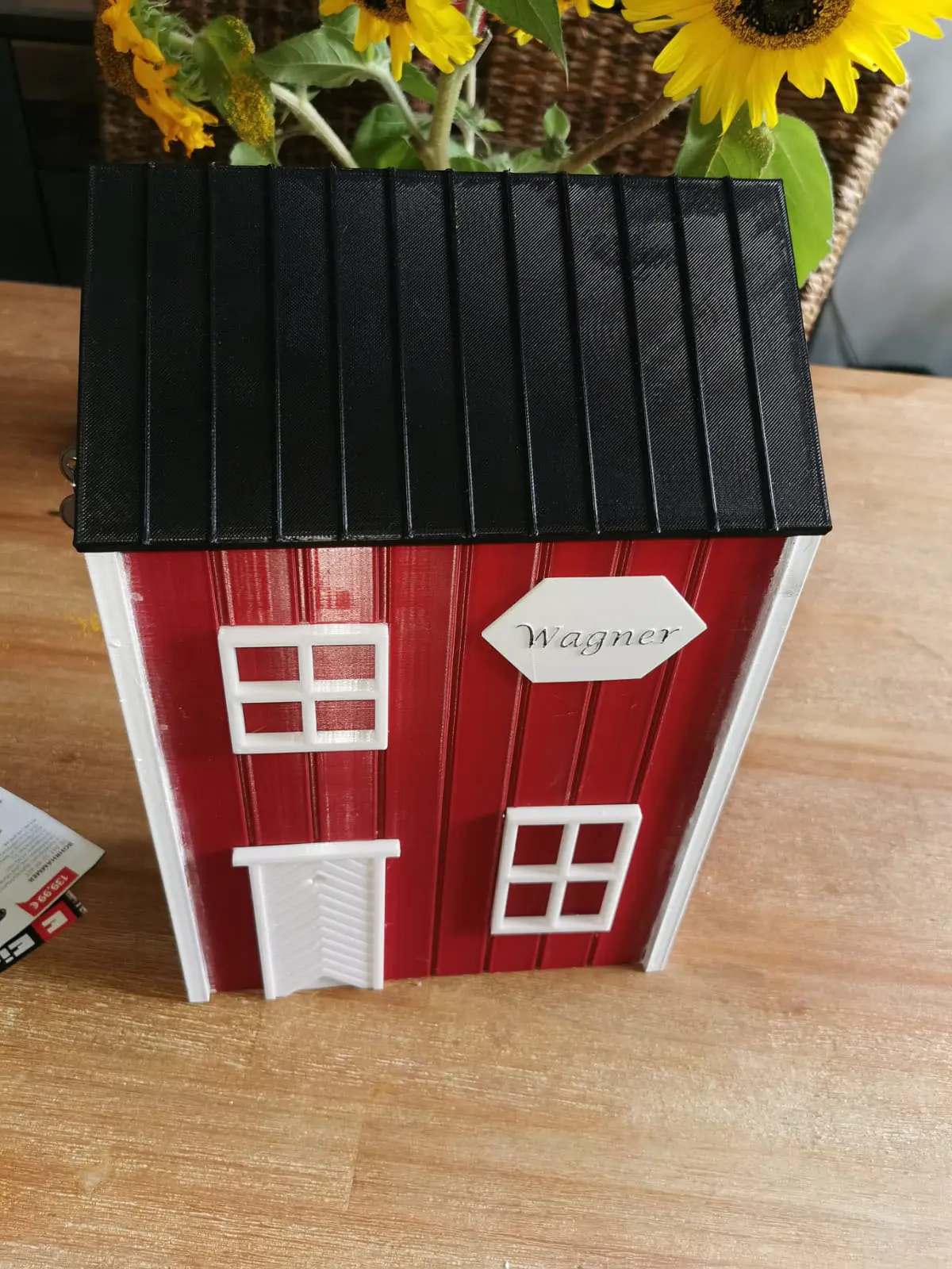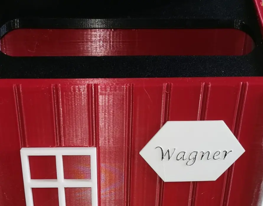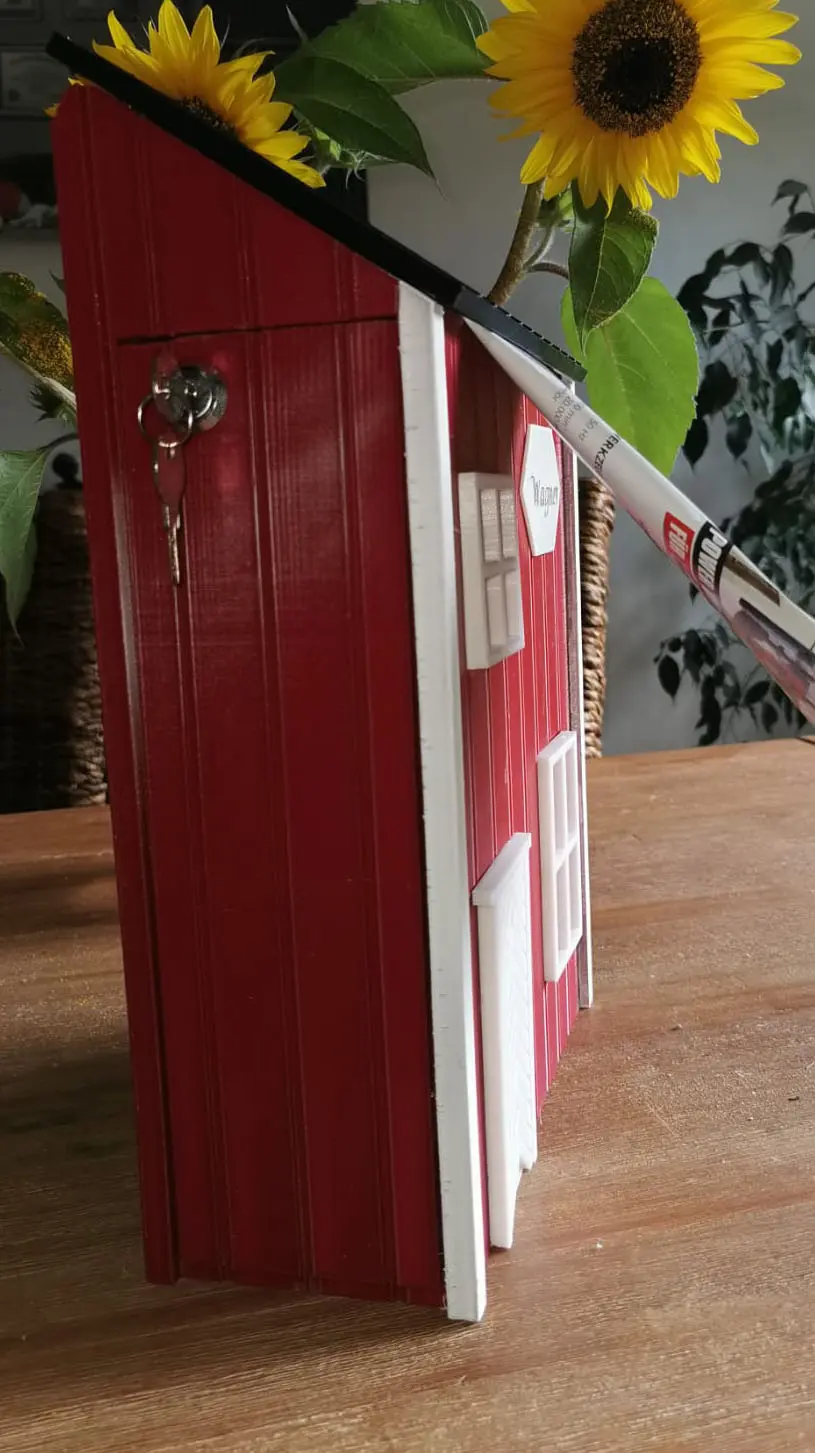 Der Korpus entsteht im 3D-Druck – sauber verarbeitet und robust. Die Maße sind alltagstauglich gewählt, DIN-A4-Umschläge passen problemlos hinein. Optisch bleibst du flexibel: Du wählst aus drei Standardfarben (Rot, Dunkelrot, Gelb) oder lässt dir eine Wunschfarbe anfertigen. Zusätzlich können Korpus sowie Dach & Einwurf farblich getrennt gestaltet werden. Auf Wunsch versehen wir den Briefkasten mit einem Namensschild – klar, ordentlich und passend zum Stil.